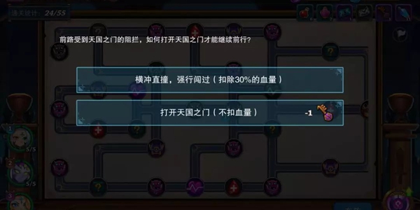 天国之门是比较棘手的一个随机事件,如果当前手中没有神秘钥匙的话,我们可以先切换其他队伍在另一条路线推进,同时留意在炼金室中是否出现神秘钥匙,也可以选择用最弱的那支队伍来硬抗这个伤害。