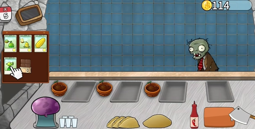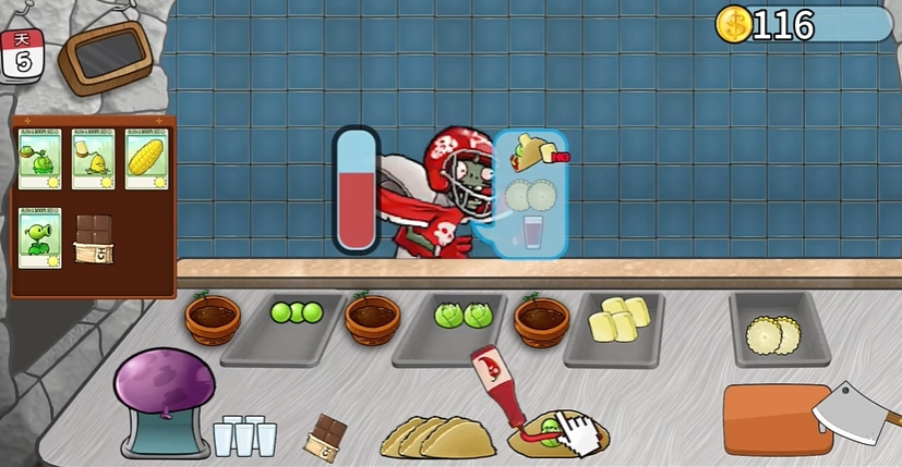 1、玩家能够在游戏中,通过植物卡牌来补充食品材料,让每一种材料都满足僵尸的需求。
