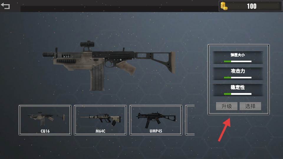 3、在武器界面,查看CQ16等枪支属性,根据需求点击【升级】,增强弹匣、攻击力、稳定性,优化战斗能力。
