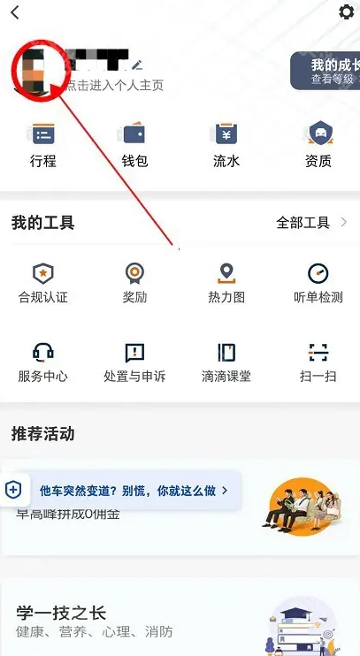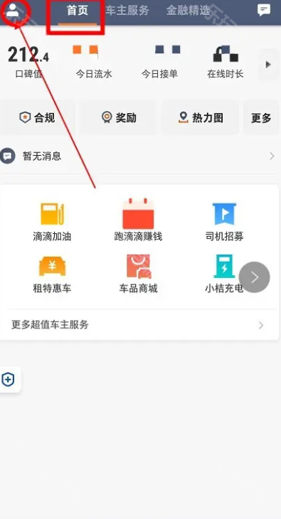 1、首先打开滴滴车主app,切换到首页后点击左上角的人头标志