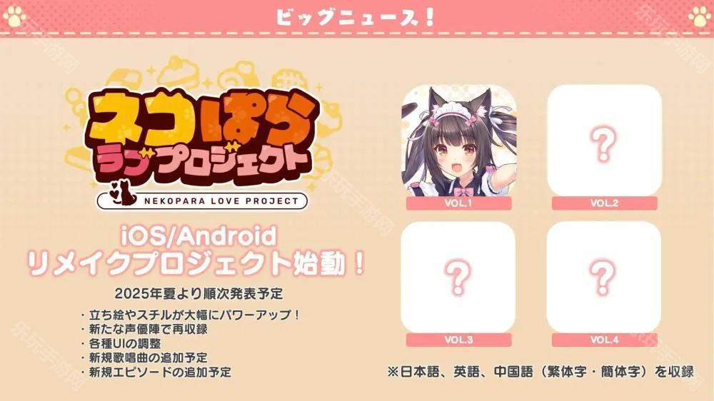 直播中也透露,为智慧型手机量身打造的《猫娘乐园(NEKOPARA)》系列重制版《NEKOPARA LOVE PROJECT》正式制作中,将收录繁体中文等语言。