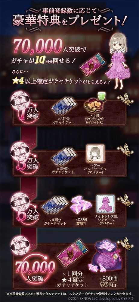 营运 DMM GAMES 的 EXNOA 宣布,成熟女性向恋爱游戏《梦幻楼与不眠之蝶(暂译,梦幻楼と眠れぬ蝶)》(iOS / Android / Web)现已于日本推出。为纪念本作上市,游戏内同步举办签到活动、以及发布事前登录报酬。